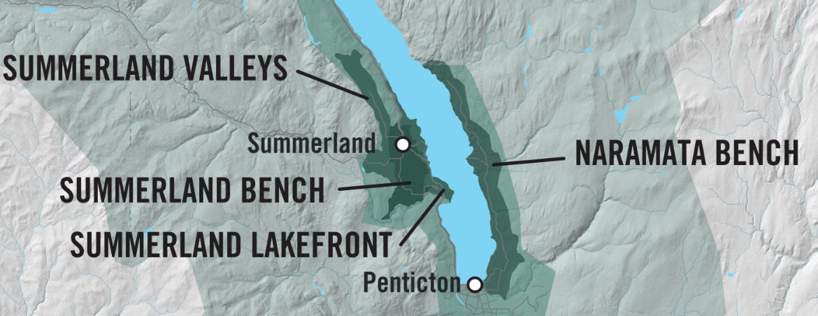 Geographical Boundaries Its boundary begins in the very southeast corner of the lake, takes a paring off the northeast corner of the city of Penticton, by running along Penticton Creek and continues inland for two kilometers before heading northward. With Okanagan Lake providing the western border, the eastern boundary line runs north, paralleling the shoreline, forming an arable margin whose width varies between one and three kilometers, ending about twenty twenty-five kilometers north at Sebastian Farms vineyards next to Okanagan Mountain Provincial Park.