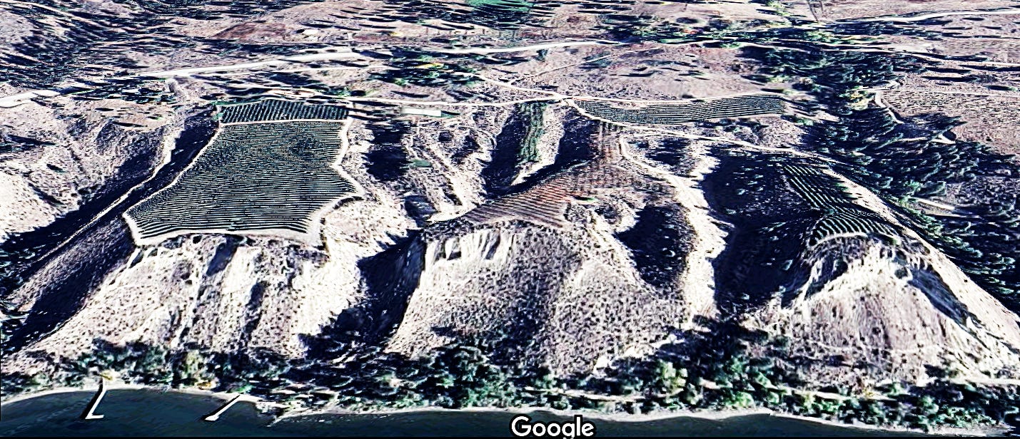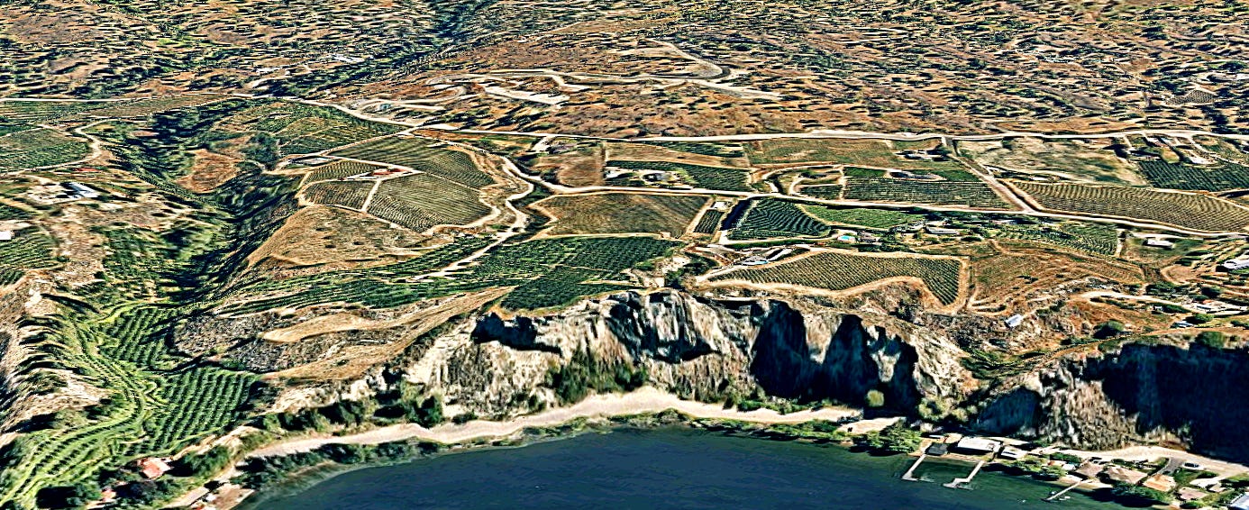 Exceptional Range of Vineyard Growing Conditions Added to the factors of latitude, altitude and proximity to water is the unusual and at times, fantastical topography of the Naramata Bench tablelands. The once-were-lake-bottom fine silt, sandy and clay sediments composing the area were vulnerable to erosion from melting glacier streams as the ice retreated thousands of years ago. Even today, these sedimented soils can become saturated and create landslides or slope failures. The remarkable result is that ranged along the northern portion of Naramata Bench, you can see gentle, undulating slopes sharply dissected by cliff-like gullies and escarpments, where water has cut through the erosive soil. In places the resulting landforms, are isolated, flat-topped headlands occasionally crowned with a carpet of vines. These tall promontories often have near vertical walls where the underlying sedimentary layers can be seen. The overall result is an irregular jumble of vineyards subject to a wide variety of geographic influences.